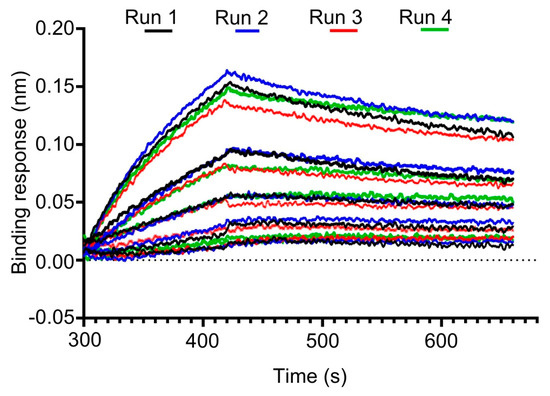 The repeatability of the binding method by a single analyst confirmed the consistency of the assay, with a KD of 5.13 × 10−8 M and CV of 13% across two independent runs indicating minimal analytical drift or artifact (Figure 4 and Table 3).