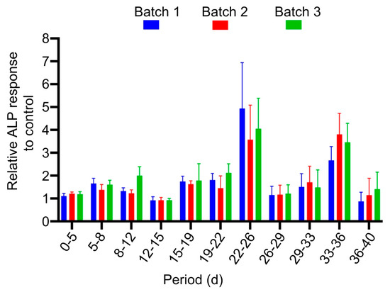 ALP response was measured to evaluate the osteogenic potential of the released rhBMP-2 over a period of 40 days. The release of bioactive rhBMP-2 was determined by assaying the ALP activity in whole cell lysates of C2C12 cells exposed to LDGraft. A strong ALP response was observed at each time point throughout the assay period, indicating the bioactive potential of rhBMP-2 post-encapsulation (Figure 5). ALP response was highest at days 22–26 and 33–36, compared to the remaining time points. All values were normalized to the corresponding positive control to allow consistent comparison across experiments. Minimal ALP activity was detected in negative controls, confirming that the observed effect was specific to the presence of released rhBMP-2.