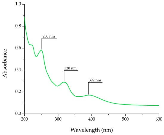 After scanning a standard solution of AAI, in the wavelength range 200–600 nm, the absorption spectrum of AAI was obtained. From Figure 1, three absorption peaks can be observed at 250 nm, 320 nm, and 392 nm, respectively, specific for AAI, and comparable to those in the literature [28,29]. Because the most intense and stable peak was obtained at 320 nm, when compared with the absorption peaks observed at 250 and 392 nm, the analysis was performed at this wavelength, supporting a fine signal-to-noise ratio.