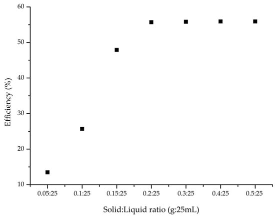 The solid/liquid (S:L) ratio is another crucial parameter for optimizing adsorption conditions. In this study, Figure 3 illustrates the effect of the S:L ratio on the adsorption efficiency.