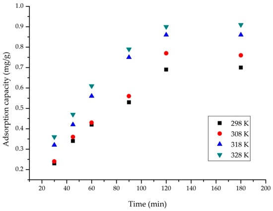 To track how contact time and temperature affect the capacity of the sorbent, a plot was generated (Figure 4). When the interaction between AC and AAI increases, the adsorption capacity rises from 0.77 to 0.9 mg/g, with variations depending on the temperature range studied (298 K to 328 K).