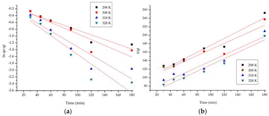 Kinetic models: (a) pseudo− first− order model; (b) pseudo− second− order model. The red lines are used to evaluate how well the experimental data fit the theoretical model.