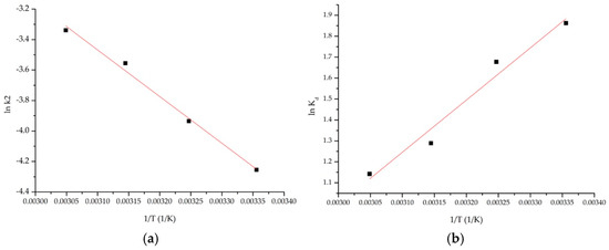 Thermodynamics studies: (a) Arrhenius; (b) lnKd = f(1/T).