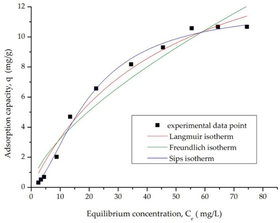 The experimental results were explored by fitting them to the Langmuir [22], Freundlich [24], and Sips [25] isotherms. The nonlinear form of Langmuir isotherm is used to describe adsorption on uniform surfaces, and the specific calculation formula is represented [26]: