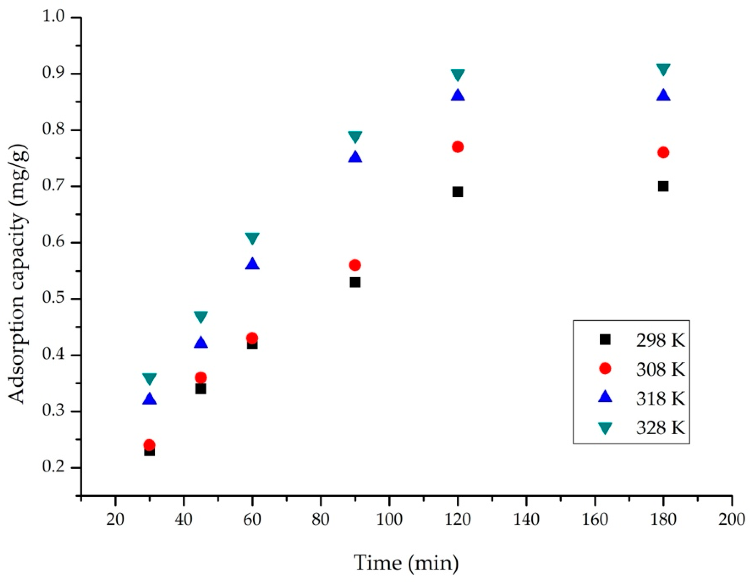 3.2. Adsorption Studies and Kinetic, Thermodynamic, and Equilibrium Studies