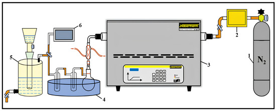 Pyrolysis of oil sludge was performed in a stationary porcelain boat placed inside a horizontal steel tubular reactor (Figure 1), installed in an automated, temperature-controlled pyrolysis furnace. Both the reactor inlet and outlet were equipped with coiled condensers to maintain the required temperature. At the reactor inlet, a gas cylinder (1) and a flow-control unit (2) were connected to regulate the pyrolysis atmosphere. At the reactor outlet, an adapter was connected to a condensation system consisting of a reflux condenser, a receiver, and two sequentially connected glass traps immersed in ice (4), as well as a gas meter for collecting pyrolysis gases (5). The collected gas subsequently underwent chromatographic analysis (6).