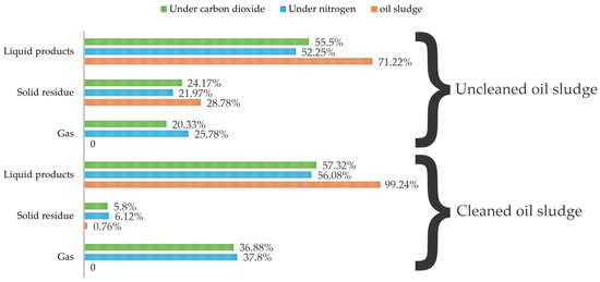 The material balance and SARA characterization of the pyrolysis process samples of uncleaned oil sludge showed higher yields of gaseous products (25.78% under N2) and solid residues (24.17% under a CO2). On the other hand, pyrolysis of cleaned oil sludge led to a decrease in the formation of solid residues (5.8% under a CO2 atmosphere) and an increase in gas products (37.8% under N2).