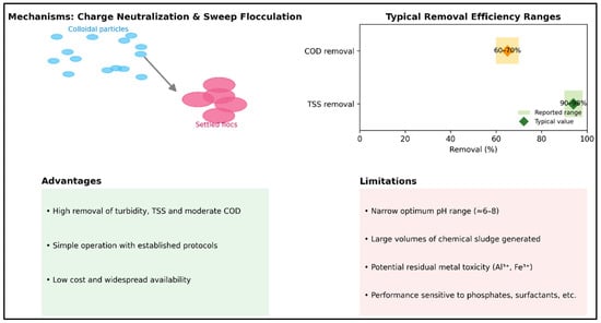 Figure 2 provides a visual synthesis of the mechanisms, performance ranges, and advantages/limitations of traditional mineral coagulants. The left panel illustrates the charge neutralization and sweep flocculation principle: small colloidal particles (blue) are aggregated by metallic salts into denser flocs (red) that settle more readily. The horizontal diagram summarizes typical performance ranges: TSS removal often exceeds 80% and can reach 90–95% under optimal conditions, while COD reduction is typically more modest, around 60–70%. These ranges are supported by recent studies. For example, using alum with 1 mg/L of polyelectrolyte, Solmaz et al. reported that COD removal increased from about 50% to 69% when the alum dose was raised to 4.05 mg/L, while turbidity and TSS removal exceeded 80% [35]. With ferric chloride, COD abatement reached approximately 70% at 1.29 mg/L and pH 5, with consistently high removal of turbidity, color, and TSS. Conversely, in studies on semi-aerobic landfill leachate, TSS removal exceeded 95%, but COD reduction was only 43%, highlighting the dependence of performance on effluent characteristics [36].