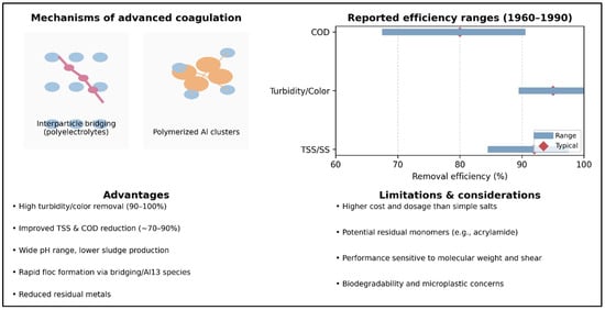 Figure 3 summarizes the major advances observed between 1960 and 1990, when two new families emerged beyond simple metallic salts: high-molecular-weight organic polyelectrolytes and polymerized mineral coagulants such as PAC and its variants. The left-hand vignette illustrates two distinct mechanisms: interparticle bridging by polymer chains, typical of polyacrylamides, polyamines, and polyDADMACs; and the rapid particle aggregation induced by high-charge-density Al13 clusters in PAC and composite coagulants. The horizontal diagram outlines typical ranges reported in the literature: advanced coagulants generally achieve >90% suspended solids removal, up to 95% turbidity and color reduction, and COD decreases between 68% and 90%, depending on effluent type and optimal dosing. For example, in chemically enhanced primary treatment (CEPT) using PAC, suspended solid removal reached 95% and COD 68% at pH 7, while another study reported 97.34% TSS and 75.76% COD removal at pH 7.5 [45]. At 10 mg/L PAC, removals of ~90% TSS and 72% COD were achieved, and coupling PAC with a biological filter increased COD abatement to 96%. Cationic polyacrylamides were capable of removing nearly all turbidity in a simulated water sample (≈99.5%), although their efficiency dropped to ~50% for complex petrochemical effluents [46]. Coagulation assisted by ferrate and PAC has yielded COD reductions of 83–93% with near-complete turbidity removal [47]. Conversely, hybrid polyamide/PAC systems applied with dissolved air flotation achieved ~90% turbidity removal but only 15% COD reduction [30], underscoring how performance varies with effluent composition and coagulant formulation.