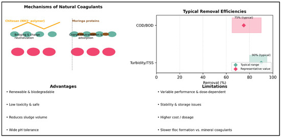 Figure 4 illustrates the principle of interparticle aggregation: biopolymers such as chitosan and cationic proteins from Moringa oleifera neutralize colloidal charges and form molecular bridges between particles, leading to their agglomeration. The panel on “Typical Removal Efficiencies” highlights ranges reported in the literature: natural coagulants generally achieve 80–95% removal of turbidity and suspended solids, and 65–90% removal of COD/BOD.