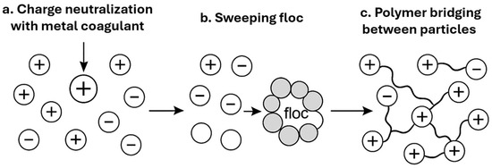 Wastewater treatment through coagulation and flocculation relies on destabilizing colloidal particles, which are naturally present in suspension. These submicron particles typically carry a negative surface charge (with zeta potentials often below −25 mV), preventing spontaneous aggregation due to strong electrostatic repulsion [73]. The addition of a coagulant interrupts this colloidal stability and promotes the aggregation of particles into larger, settleable flocs. This process involves four fundamental physico-chemical mechanisms, often interconnected and highly dependent on operating conditions. These mechanisms are schematically illustrated in Figure 6