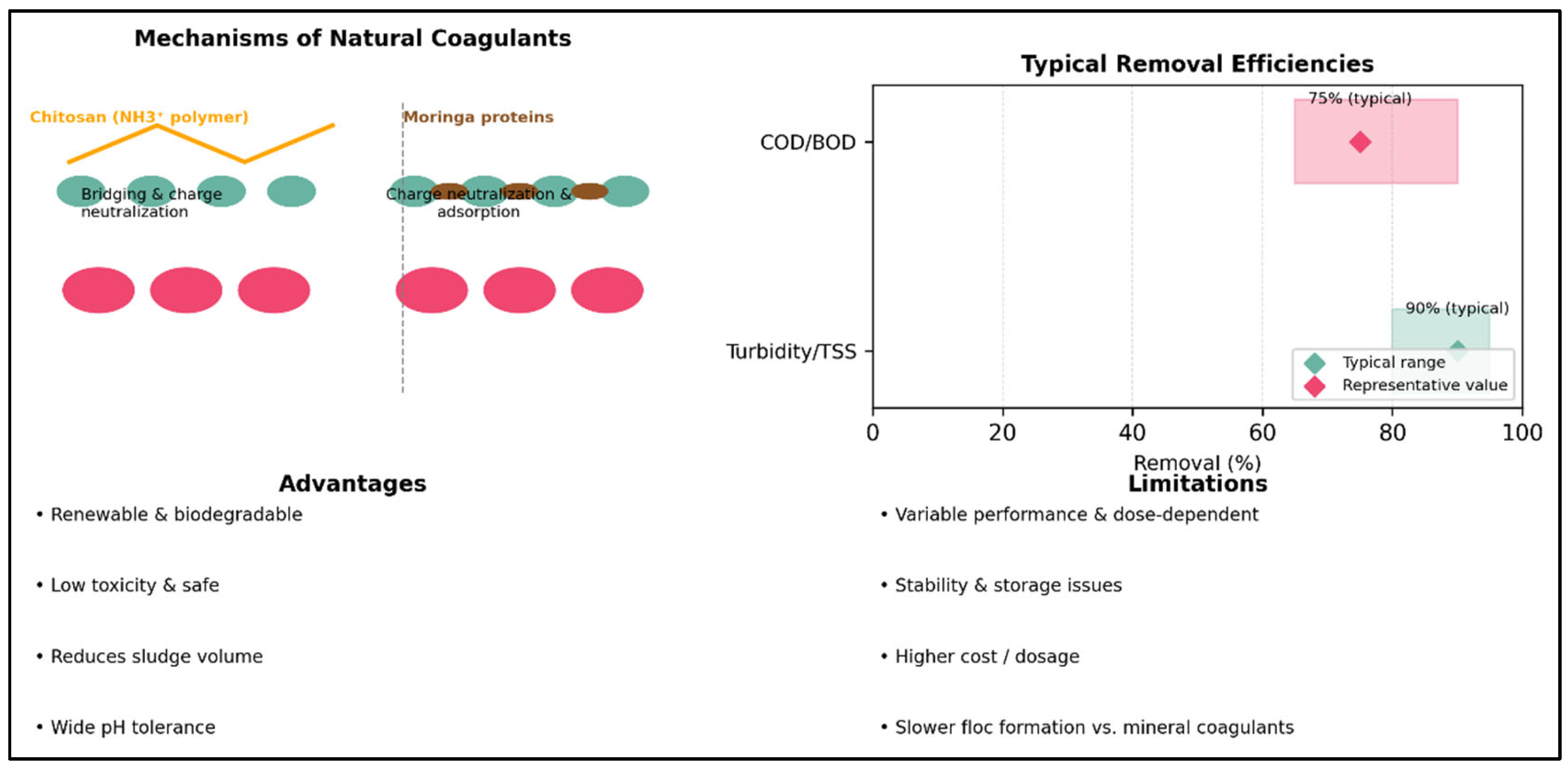 | Natural (chitosan, Moringa, mucilage, lignin) | Turbidity 70–95%, MES 60–90%, metals 40–70% | 10–300 (variable depending on biomass) | 5–8 (chitosan ≤ 7) | 1–2 (seeds) à >50 (chitosan) | Biodegradable—Low toxicity—Renewable source | Batch variability—Limited storage—Extra cost (chitosan) | Decentralized processes, agro-industries, micropollutants | [107,108,109,110,111] |