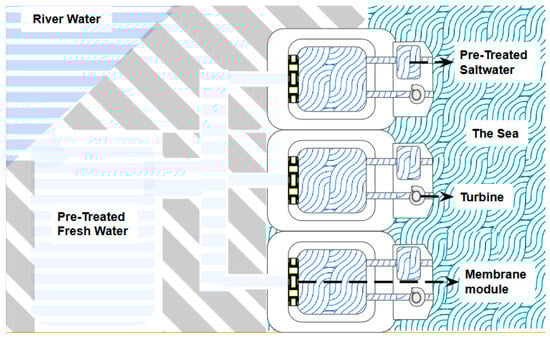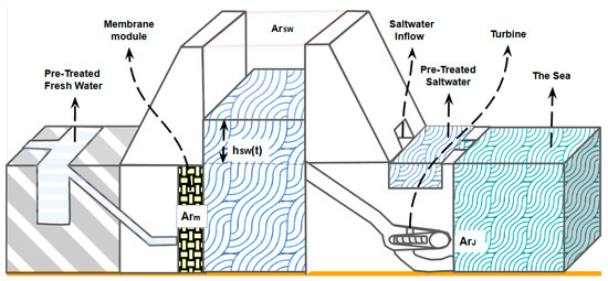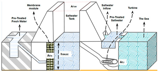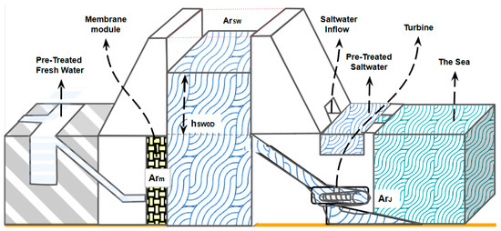 Similar to the previously mentioned concepts, the proposed osmotic power plant is tailored for deployment in places where natural freshwater–saltwater mixing occurs. The main components of the proposed osmotic power plant are presented in Figure 1.