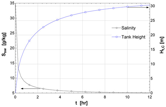 When the saltwater tank reaches the desired height , we define the ending of the charging stage. In this instant, due to the influx of freshwater into the saltwater tank, the salinity will drop to a factor of the initial salinity . The instant in time when this happens will be called . Equation (10) is by definition the salinity at :