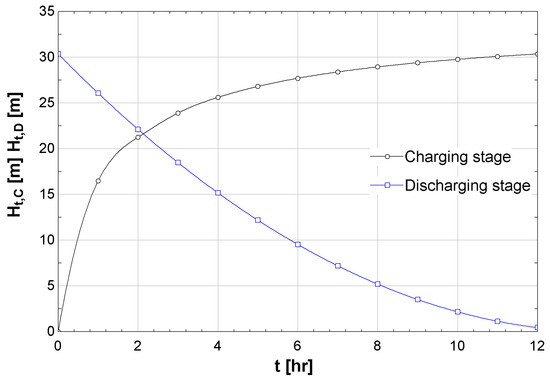 Figure 6 presents the curves for the charging and discharging stages. As the charging stage depends on a solution–diffusion process, it has a steep start that slows down as time passes and the salinity of the draw solution decreases. The change in height for the discharging stage is mainly a gravity-driven process. It depends on the initial height of the saltwater tank and on the diameter of the outflow pipe that defines the area of the water jet that will impel the turbine.