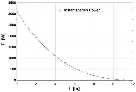 Similarly, Figure 7 presents the change in the instantaneous power over time. As the generated power mathematically depends on a power of of the height, the outflow pressure decreases exponentially as the saltwater tank height decreases. Although the simulation results indicate that the discharging stage of the proposed forward osmosis power plant yields the majority of its energy output within the first two hours, setting equal durations for the charging and discharging stages, such as 12 h each, remains a strategically advantageous design choice. This symmetrical cycle facilitates the implementation of multiple modular systems operating in tandem, where one unit charges while another discharges. In doing so, it becomes possible to maintain continuous energy generation at the plant level, even if individual modules exhibit non-uniform output over time.