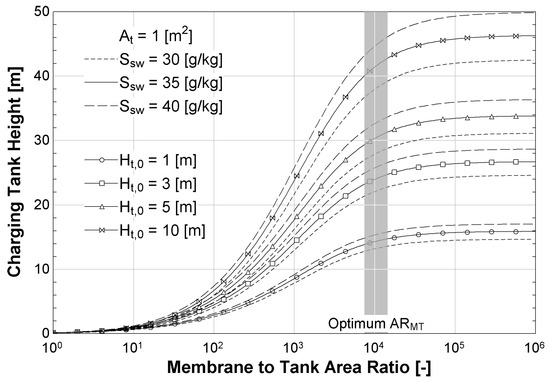 Variations in tank height with variation in the membrane-to-tank-area ratio. Each of the four symbols represents a different initial charging tank height. The line styles correspond to different salinity levels: the continuous line indicates the central salinity value of 35 g/L, the short dashed lines represent the combinations with a lower salinity level of 30 g/L, and the long dashed lines represent the combinations with a higher salinity level of 40 g/L.