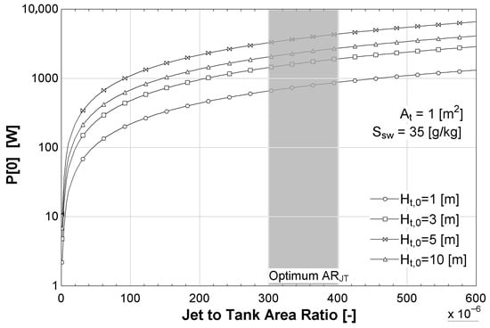 The influence of the outflow-jet-to-tank-area ratio on the system’s performance was analyzed in terms of both instantaneous power and total energy generation for different initial saltwater tank heights under the sea level ( = 1, 3, 5, and 10 m) and for fixed values for the saltwater tank area and the salinity . As shown in Figure 9, increasing results in a rapid rise in instantaneous power output, especially for lower values of . However, beyond approximately , the growth in power begins to saturate, indicating diminishing returns. For all tested values of , an optimal range of (shaded area) was identified where the instantaneous power exceeds 1 kW, which is considered the minimum threshold for turbine operation. There exists an optimal operating range of , where instantaneous power generation is maximized while ensuring that the water jet has sufficient mechanical energy to drive a turbine effectively. Values below were discarded from the optimization, as they correspond to impractically narrow jets.
