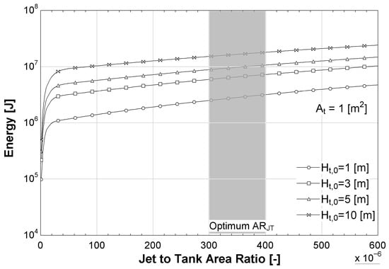 In Figure 10, a similar trend is observed for total generated energy. The energy output increases with , showing a near-linear behavior beyond the initial steep slope. Although the rate of increase is less sharp than in the power case, the gain in energy output is sustained over a broader range of , especially for larger tank heights. While power output saturates at high values, total energy generation continues to benefit from increased . However, this must be balanced against practical design constraints and construction feasibility. The optimal range for balances energy efficiency with jet size appropriate for turbine operation.