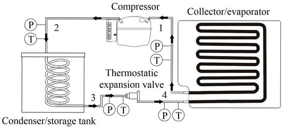In the quest for continuous improvement of different industrial processes, the study of data through statistical science currently plays a very important role in the evolution of processes, as well as in the search for new, environmentally friendly energy sources. Flat plate collectors/evaporators with natural refrigerant as the working fluid are a clear example of this and have been introduced into industry as replacements for conventional ones. The working fluid in these collectors undergoes a transformation from liquid to vapor, and the collected solar energy manifests itself as the latent heat of vaporization. Figure 1 shows a schematic diagram of a DX-SAHP system, considering the pressure (P) and temperature (T). DX-SAHP systems mainly consist of an evaporator, compressor, condenser, and expansion device. In the equipment, a flat-plate solar collector is integrated into a heat pump. The refrigerant flows through the solar collector, where it changes from liquid to vapor as it absorbs solar thermal energy [25].