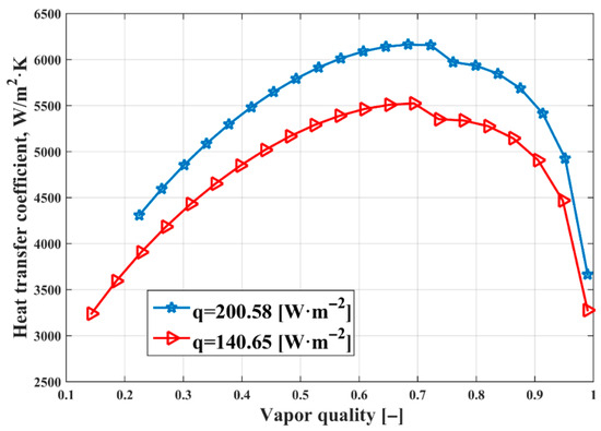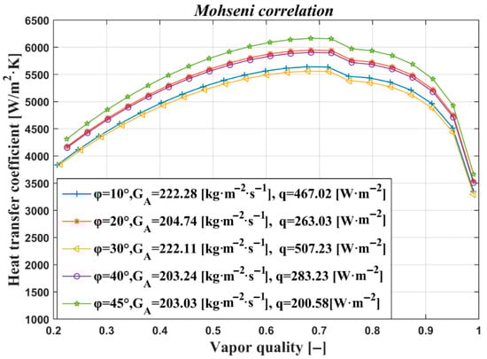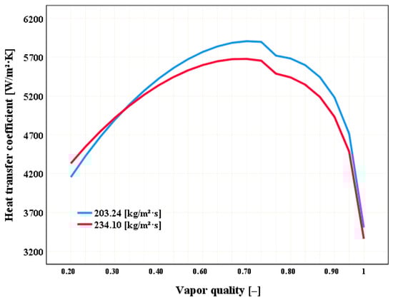 The influence produced by mass velocities of 234.10 and 203.24 kg·m−2·s−1 on the heat transfer coefficient using an angle of 40° is shown in Figure 4, where the largest heat transfer curve occurs with the mass velocity of 234.10 kg·m−2·s−1, which is the highest and has a peak of approximately 6500 W·m−2·K−1. The increase in mass velocities indicates an increase in the CTC coefficient, as shown in Figure 4.