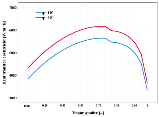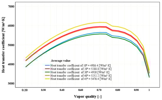 To identify the variation produced by the effect of inclination angles on the CTC, curves are plotted with angles of 10 and 45°, which are the minimum and maximum values, respectively, presented in this research and shown in Figure 3, where the CTC with an angle of 45° is greater than the angle of 10° throughout the entire steam quality line and has an approximate peak of 6200 W·m−2·K−1. For both angles, the CTC lines show the same trends, and it can be observed that the angles influence the increase in CTC. This analysis emphasizes how important it is to take inclination into account when designing and optimizing thermal systems since geometrical variations can have a significant impact on the coefficient of transference of heat. Furthermore, the similarity in curves suggests that, even while the angle affects the CTC magnitude, the system’s overall behavior remains consistent, which could make it easier to predict and model under various operating conditions.