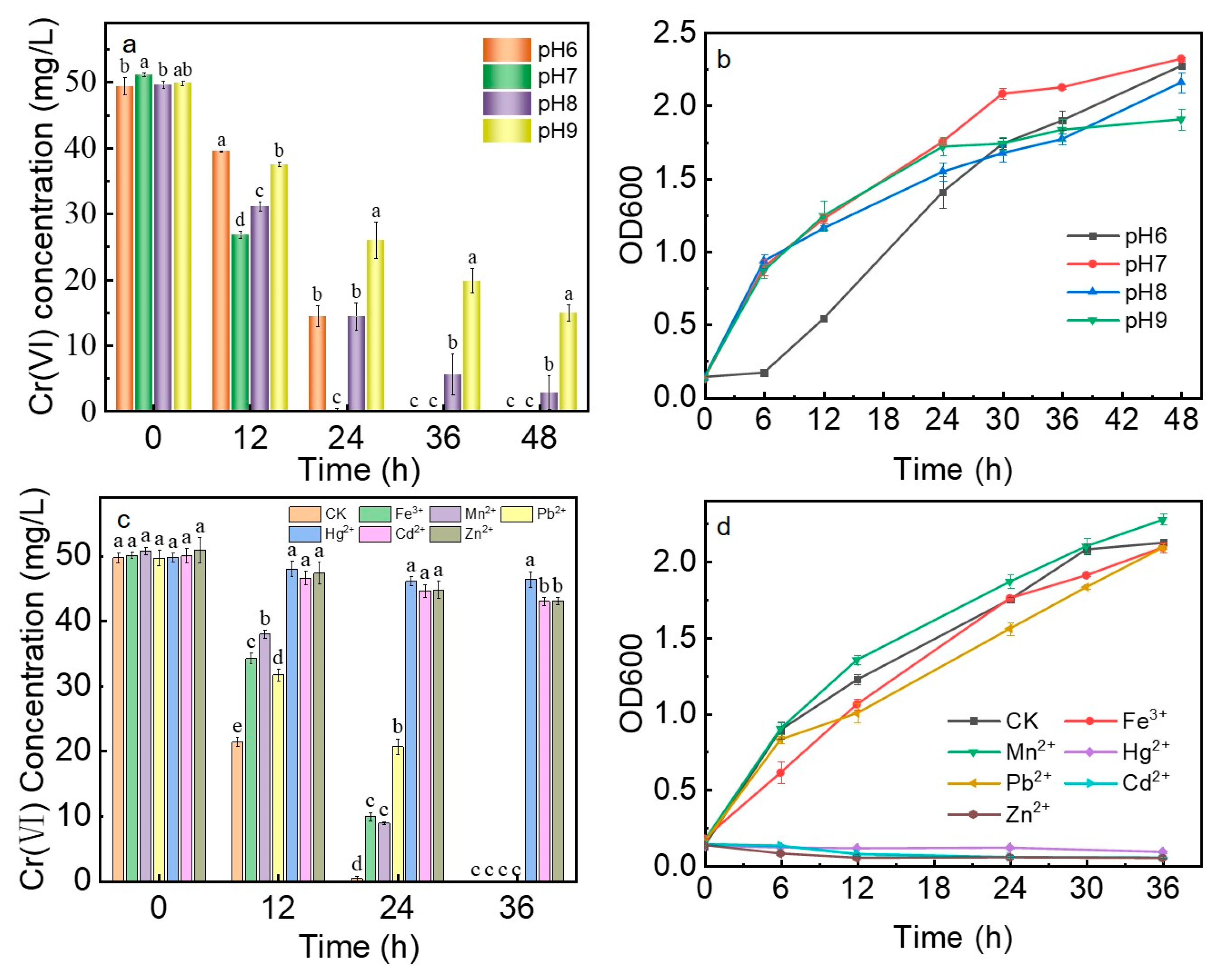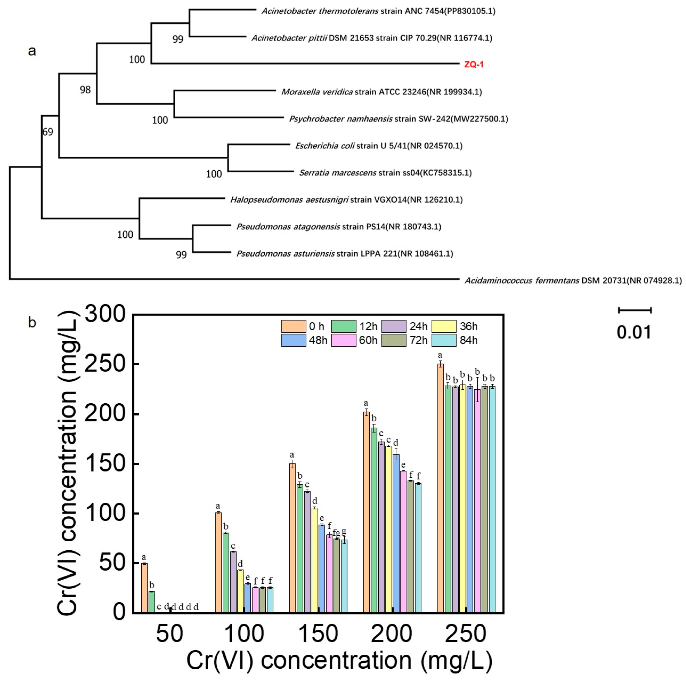 - Shi, Y.; Wang, Z.; Li, H.; Yan, Z.; Meng, Z.; Liu, C.; Chen, J.; Duan, C. Resistance mechanisms and remediation potential of hexavalent chromium in Pseudomonas sp. strain AN-B15. Ecotoxicol. Environ. Saf. 2023, 250, 114498. [Google Scholar] [CrossRef]