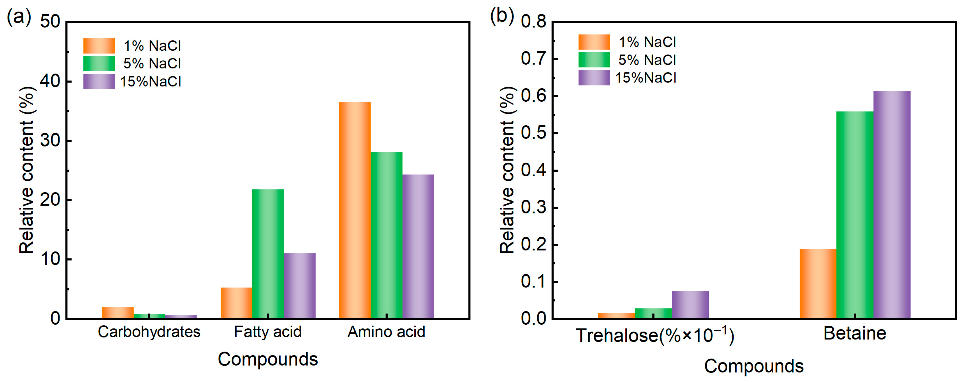- Hu, X.; Li, D.; Qiao, Y.; Song, Q.; Guan, Z.; Qiu, K.; Cao, J.; Huang, L. Salt tolerance mechanism of a hydrocarbon-degrading strain: Salt tolerance mediated by accumulated betaine in cells. J. Hazard. Mater. 2020, 392, 122326. [Google Scholar] [CrossRef]