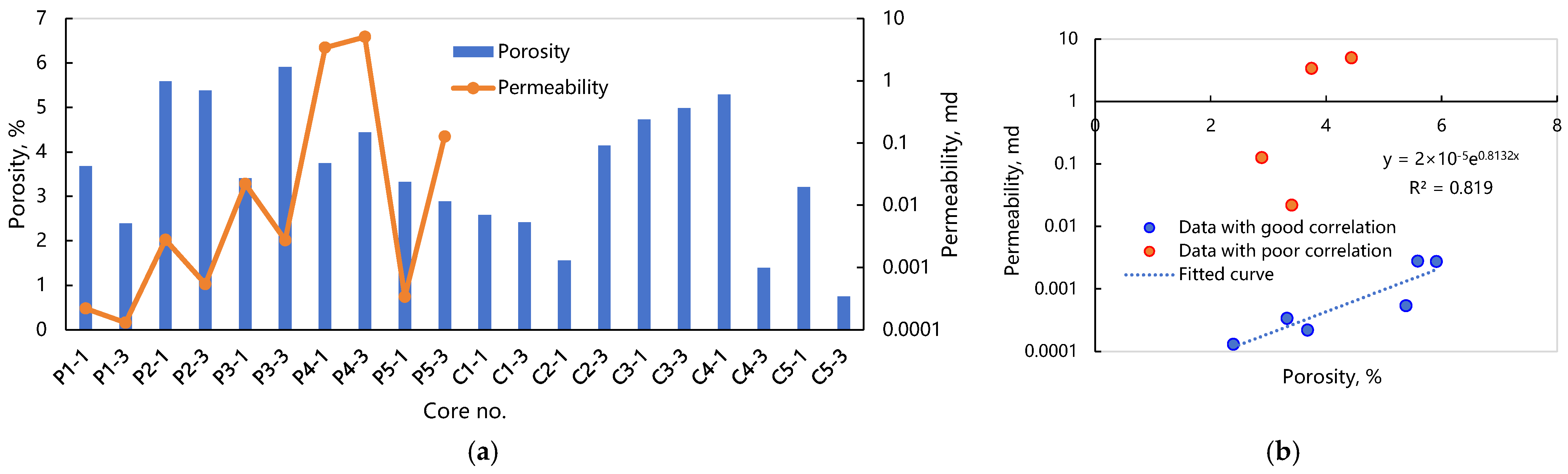 | Sample Code | Sampling Direction | Diameter, cm | Length, cm | Porosity, % | Permeability, md | Original, g | After Drying, g | After Heating, g | Weight Loss Rate, % |