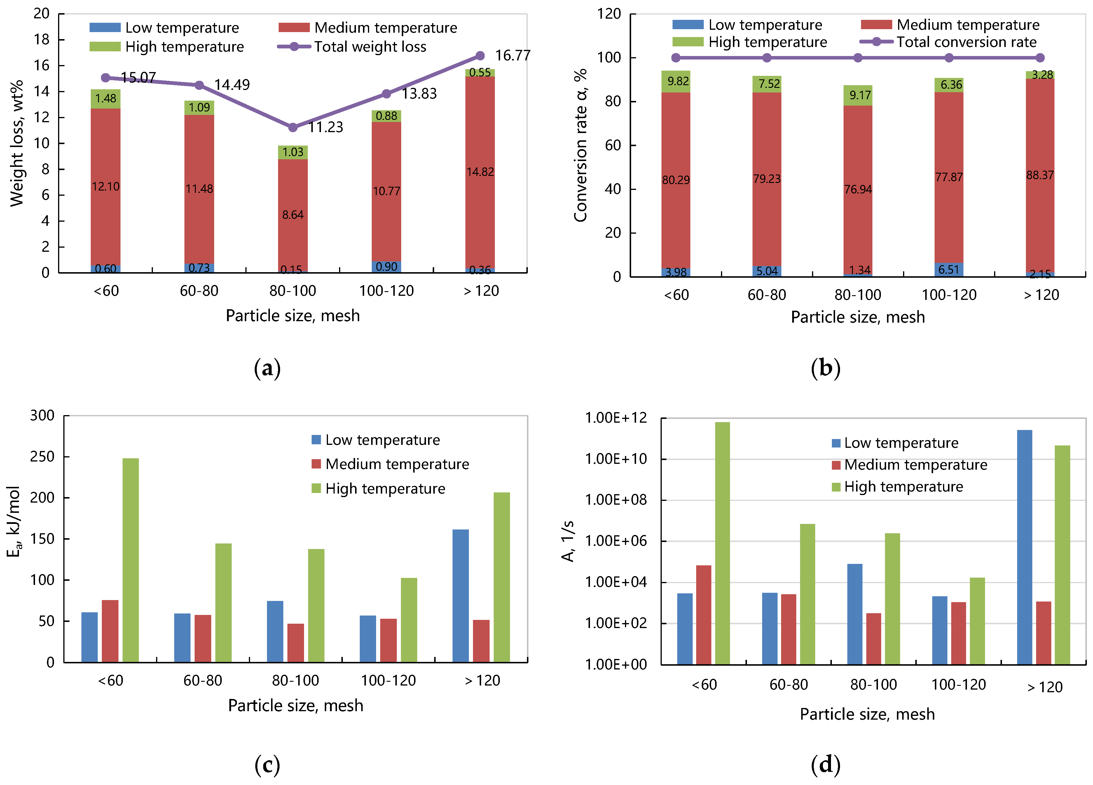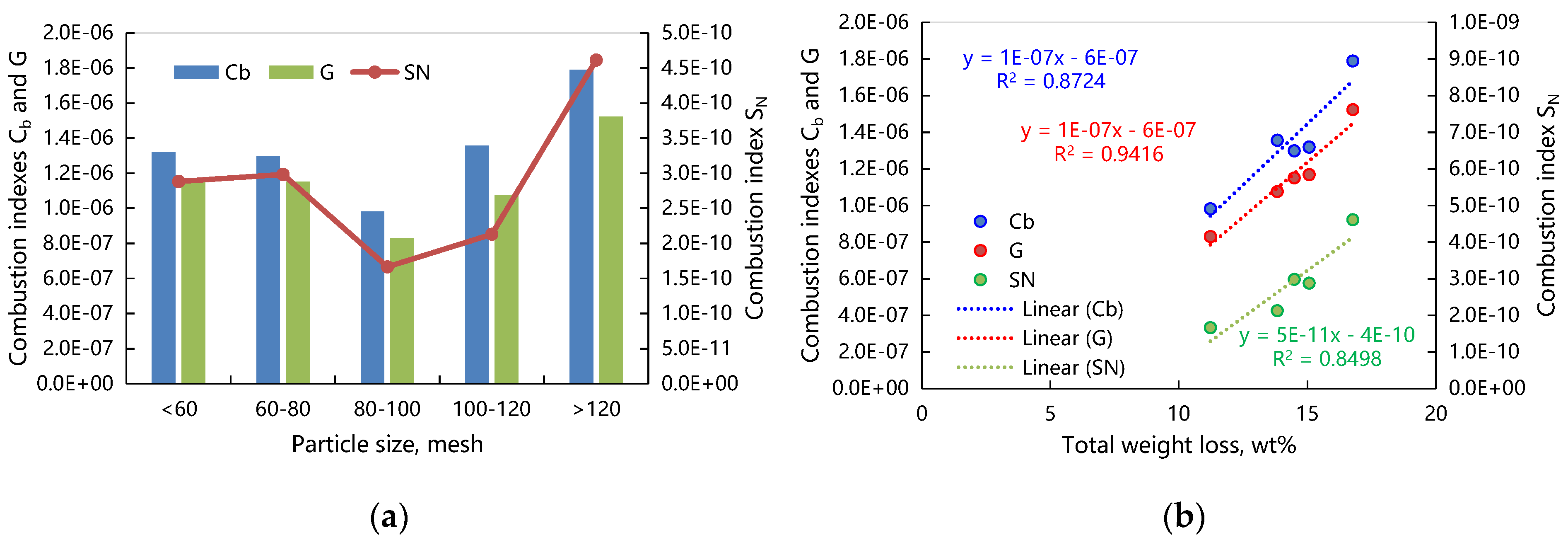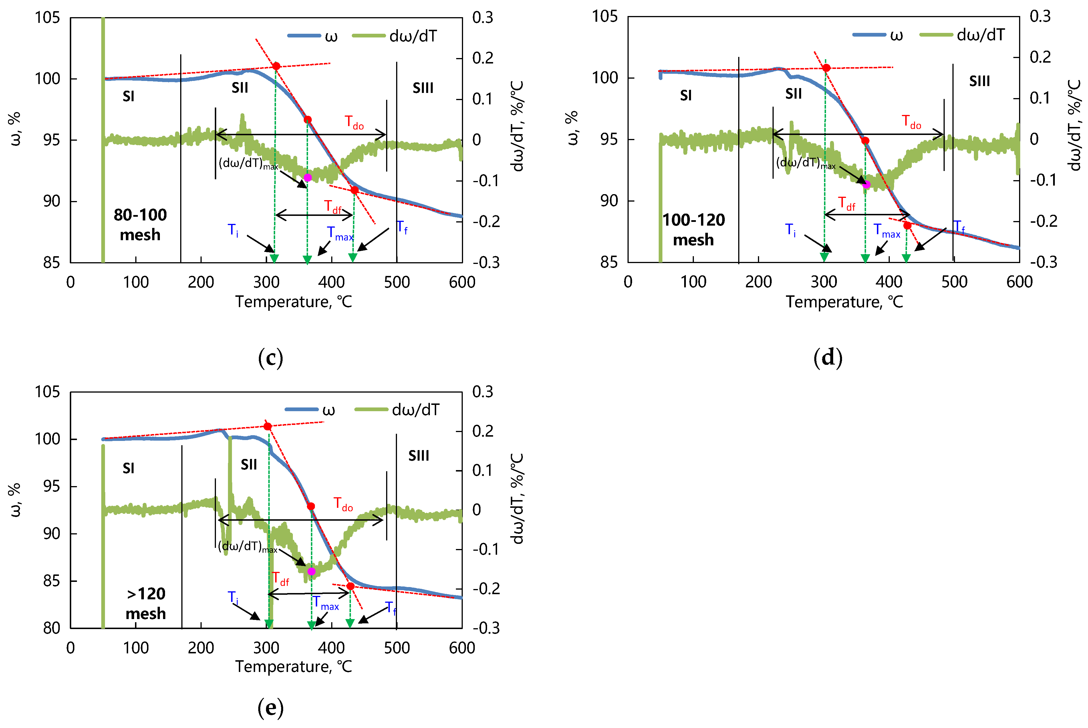 | Particle Size, Mesh | Ti, °C | Tf, °C | Tmax, °C | (dω/dT)max, %/°C | (dω/dT)mean, %/°C | Cb | G | SN | Stage I: Dehydration, °C | Stage II: Oxidative Pyrolysis of Organic Matter, °C | Stage III: Oxidative Pyrolysis of Inorganic Matter, °C | ||