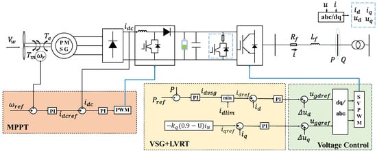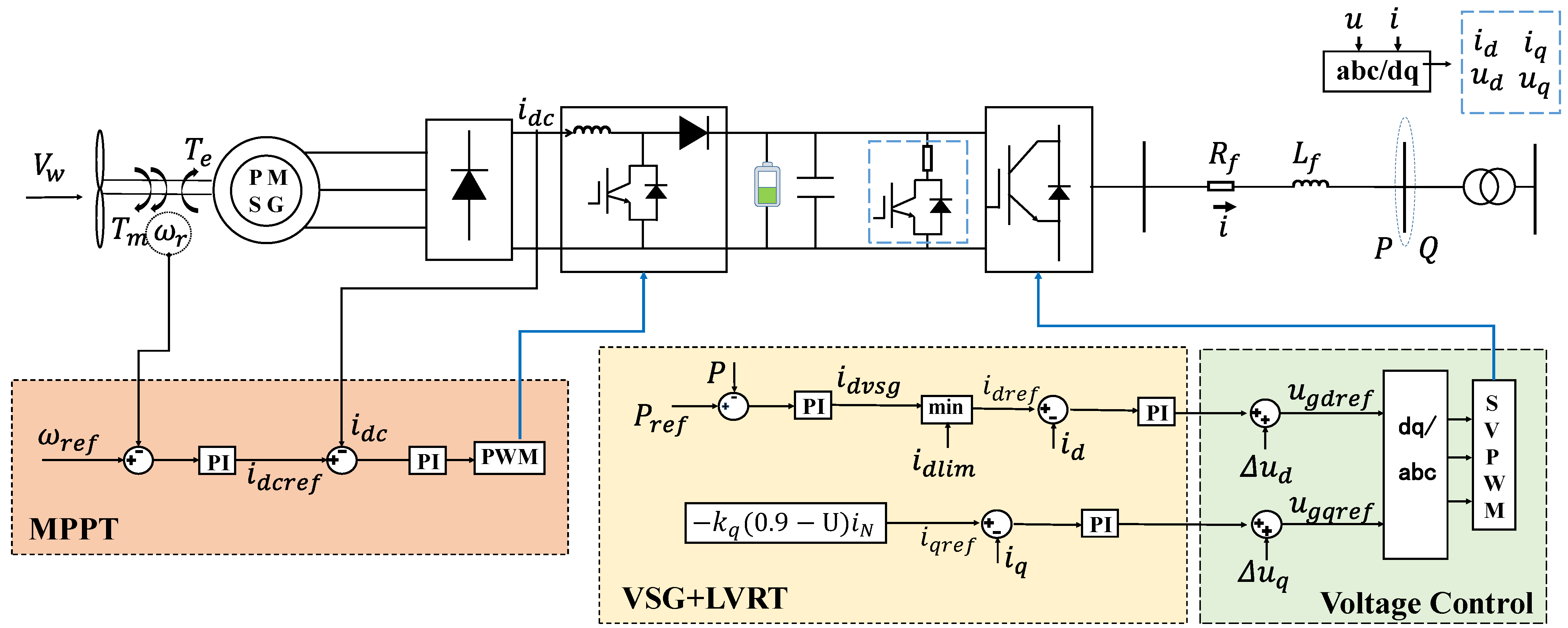 - This paper proposes a pioneering control strategy that seamlessly integrates VSG with LVRT capability for PMSGs. This unified framework enables simultaneous inertia support during frequency disturbances and compliant reactive current injection during voltage sags, effectively eliminating the need for mode switching.