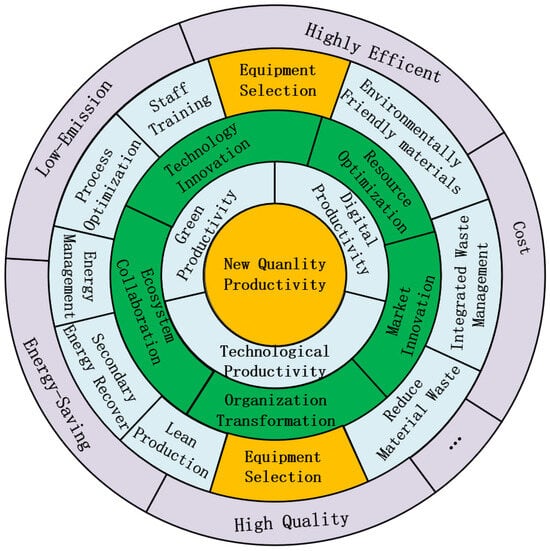 New quality productivity (NQP) represents an advanced form of productivity characterized by high technological content, operational efficiency, and product or process quality. The high-level conceptual framework of NQP [21,22] is illustrated in Figure 2. The core of NPQ is digital productivity, technological productivity, and green productivity, which can enable high-quality development of the economy and manufacturing industry (First circle). The high-quality development can be represented by innovative development, coordinated development, green development, open development, and shared development (Second circle). The NQP provides a multidimensional decision-making framework for device selection, as a mechanism to drive businesses to make rational choices in complex market and technological environments (Third circle). One is to drive enterprises to select more effective equipment in the manufacturing process to achieve high-quality development (Fourth circle). Under the guidance of new quality productivity, the key objective of equipment selection is to pursue more efficient, low-carbon, low-energy consumption, and other objectives in enterprise production activities (Fifth circle).