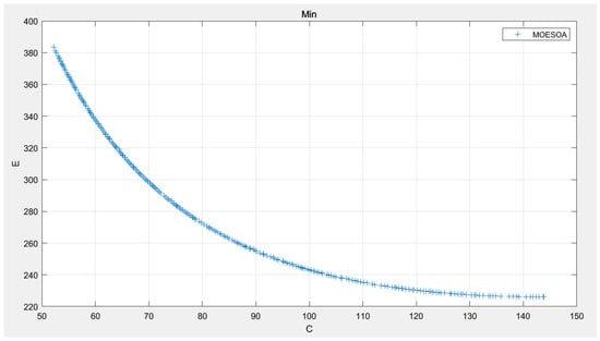 Figure 5 is optimization result of the MESOA, where E represents energy consumption and C represents carbon emissions. Under the optimization of the MESOA, the optimization model with two objectives performs well in terms of convergence. At the same time, we will both equipment parameters optimization results were compared, the optimization results of M1 matrix (397.9, 0.038, 0.039, 107.7, 233.57), and the optimizing results M2 matrix (2,790,270.6, 2.9, 118.1, 228.68). Obviously, after being optimized by MESOA, the processing parameters of both have been reasonably optimized, and both carbon emissions and energy consumption have achieved better results, verifying the superiority of MESOA. However, the relevant conclusions can still be further analyzed through Figure 5. As can be seen from Figure 5, across the entire Pareto frontier, as carbon emissions increase, the energy consumption of the equipment decreases. Therefore, based on this, in the face of different carbon emission and energy consumption selection strategies, the final result can be further optimized by changing the weights of carbon emissions or energy consumption to support a better equipment selection result.