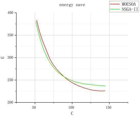 From Figure 6, it can be seen that the Pareto of the two intersect. The detailed Pareto solution sets of the two algorithms are shown in Figure 6. In the first half of the Pareto solution set, the NSGA-2 algorithm outperforms MESOA. In the later stage of the algorithm, MESOA outperforms NSGA-2 by 5.3%. Overall, the superiority and effectiveness of the MESOA have been verified.
