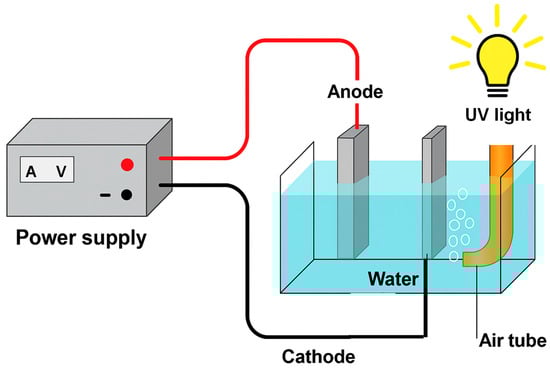 All electrodes had a geometric surface area of 4 cm2 and were placed vertically at a 1.0 cm interelectrode distance. A constant current density (j) of 20, 40, or 60 mA cm−2 was applied using a BK Precision 1688B (22820 Savi Ranch Parkway Yorba Linda, CA 92887 USA) power source. Air was bubbled through the solution at 1.5 L min−1 to ensure oxygen availability for in situ H2O2 generation at the cathode.
