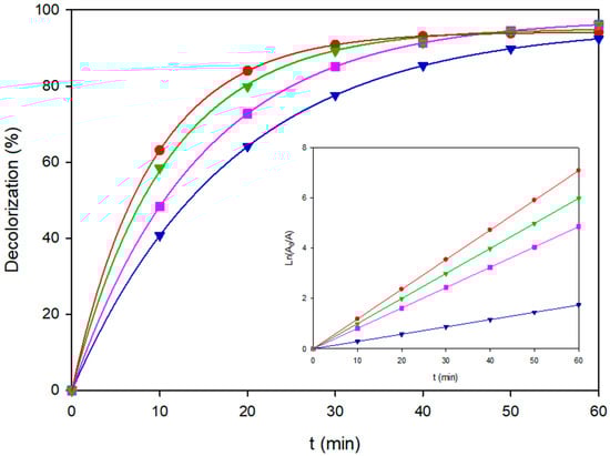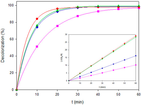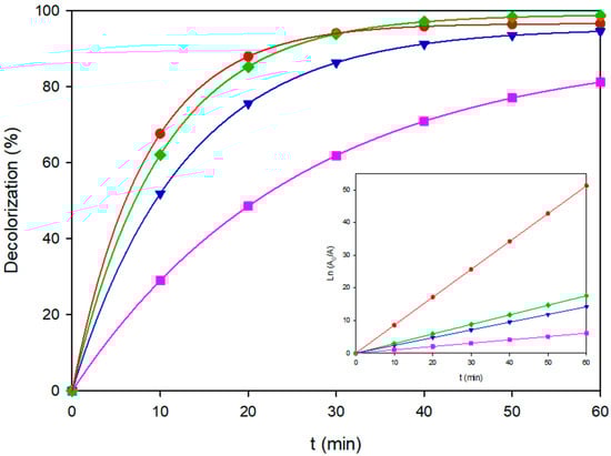 Decolorization of Brown RBH under representative EAOPS configurations. (▼) AO-BDD, 40 mg L−1, (■) AO-MMO, 80 mg L−1, (▼) EF-BDD, 120 mg L−1, and (●) PEF-MMO, 80 mgL−1. The inset panel shows the corresponding linearized plots of Ln(A0/A) vs. time.