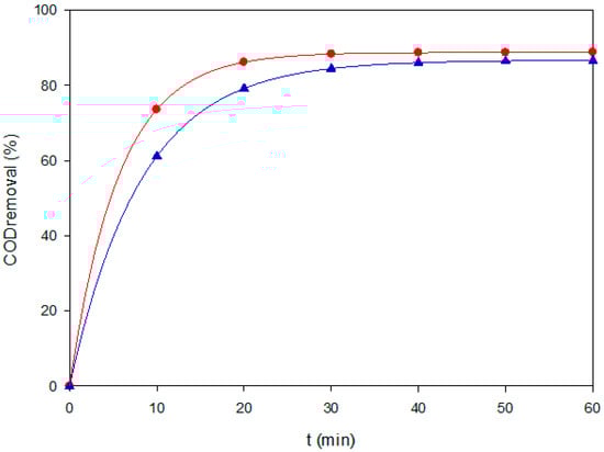 COD removal of Coriasol CB Red under two representative EAOPS conditions: (▲) AO–BDD at 40 mg L−1 and 60 mA cm−2, and (●) PEF–MMO at 120 mg L−1 and 60 mA cm−2.