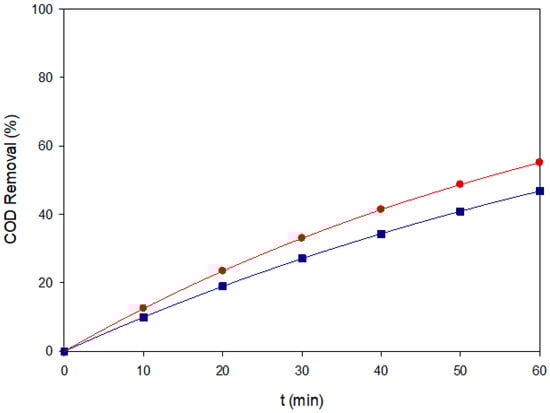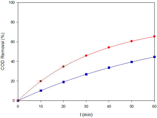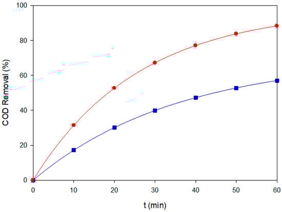 COD removal of Brown RBH under two representative EAOPS conditions: (■) EF–BDD at 120 mg L−1 and 60 mA cm−2, and (●) PEF–MMO at 80 mg L−1 and 60 mA cm−2.