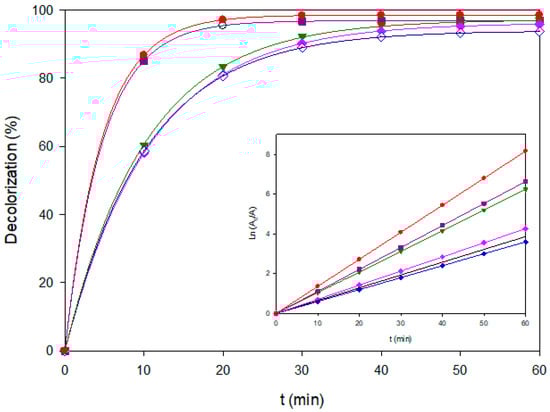Decolorization profiles of the ternary dye mixture (120 mg L−1, pH 3.0) treated by different EAOPs at 60 mA cm−2: AO-BDD (–), AO-MMO (◊♦), EF-BDD (♦), EF-MMO (▼), PEF-BDD (■), and PEF-MMO (●). The inset shows the corresponding Ln(A0/A) vs. time.