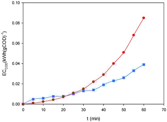 Evolution of normalized energy consumption (ECCOD, kWh·gCOD−1) during the treatment of the ternary dye mixture (200 mg L−1, pH 3.0) by EF-BDD (■) and PEF-MMO (●) at 60 mA cm−2.