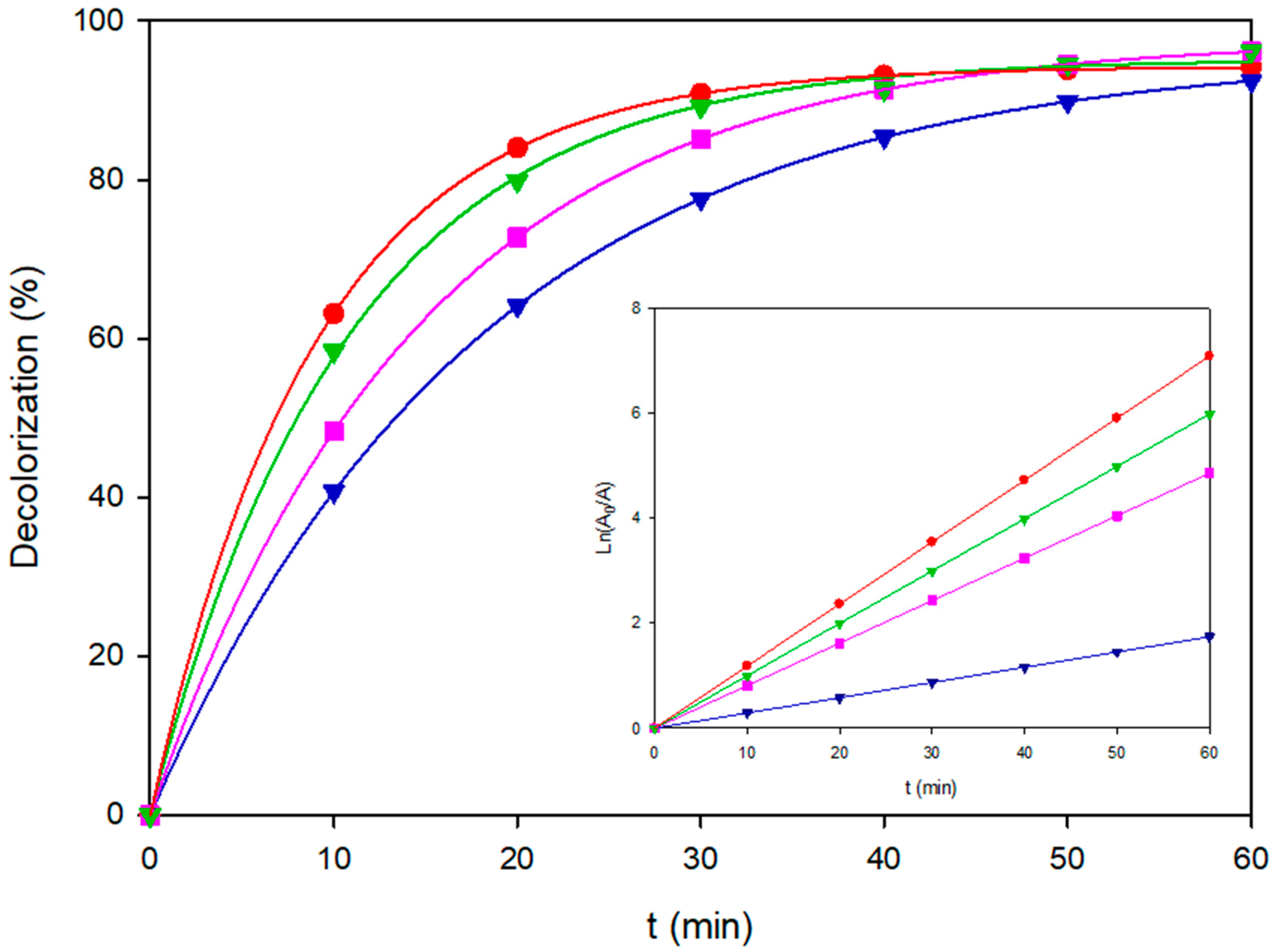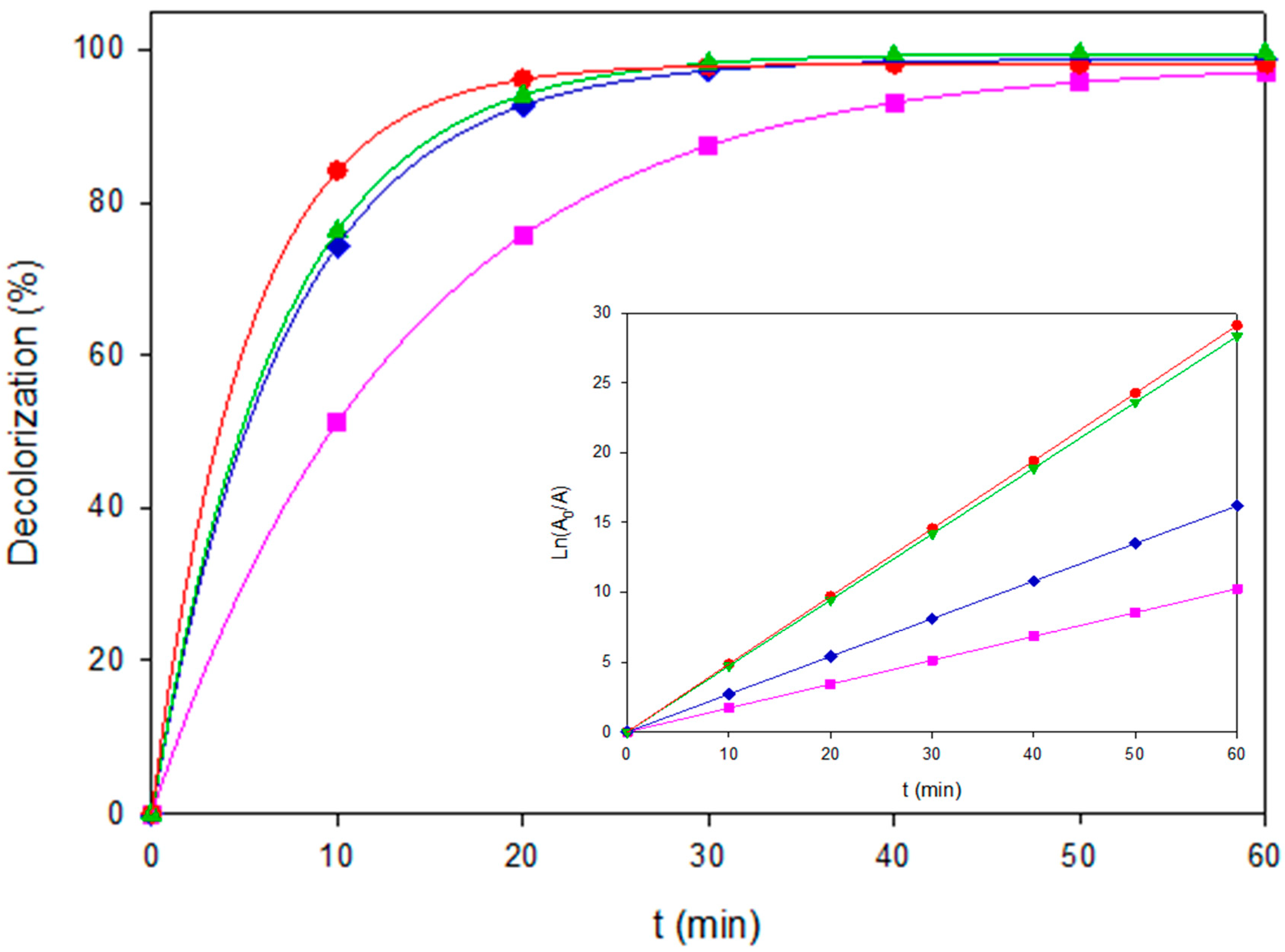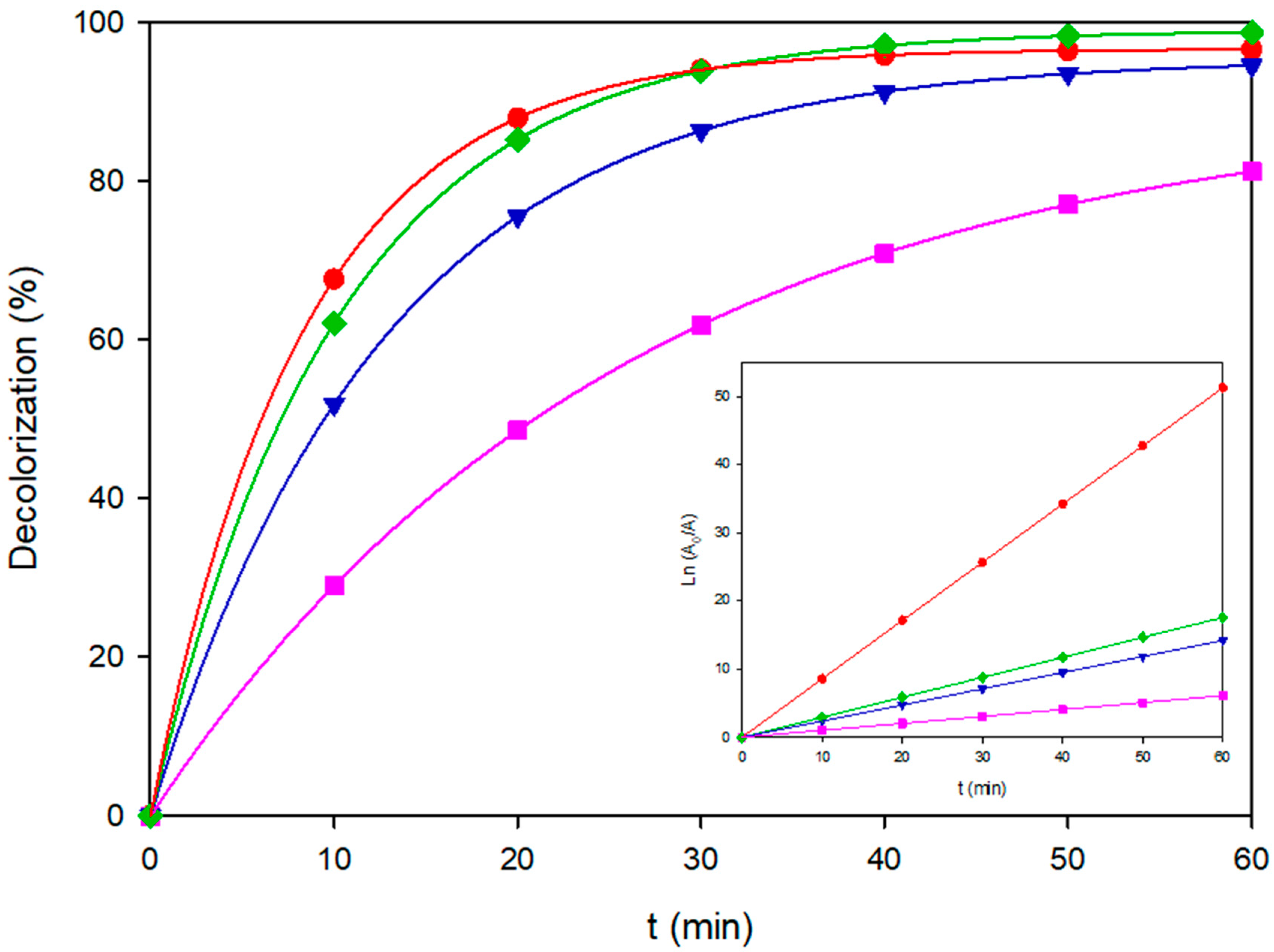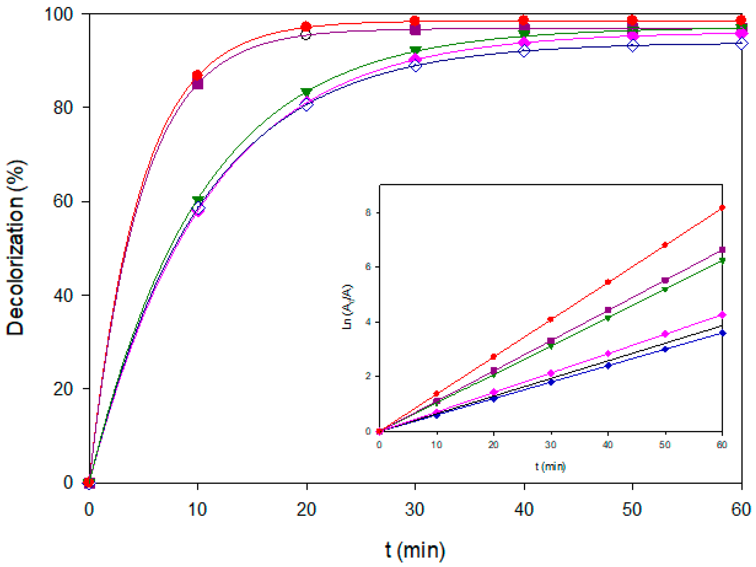 −2. The corresponding first-order rate constants for decoloration, ultimate color removal efficiencies, and time to 90% decolorization are summarized in