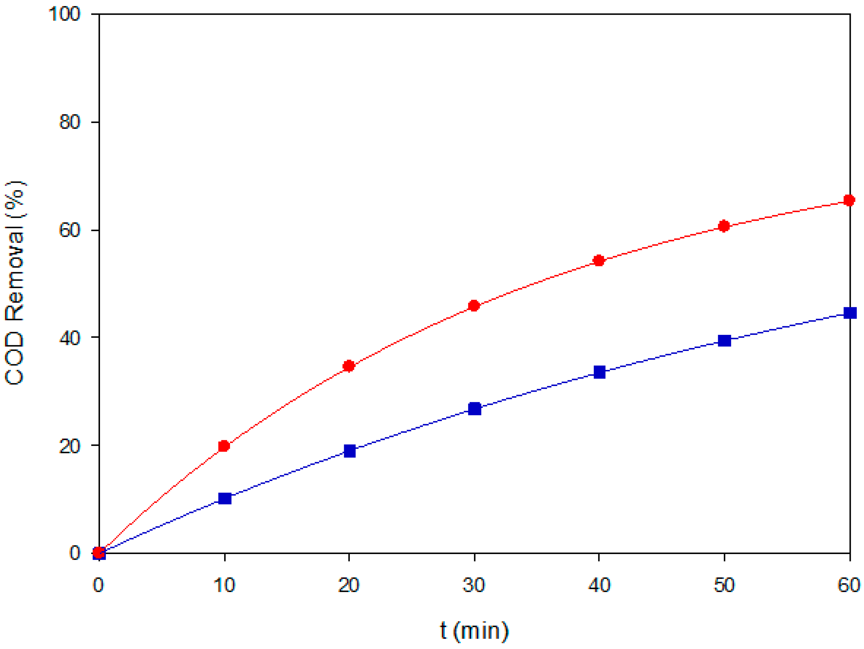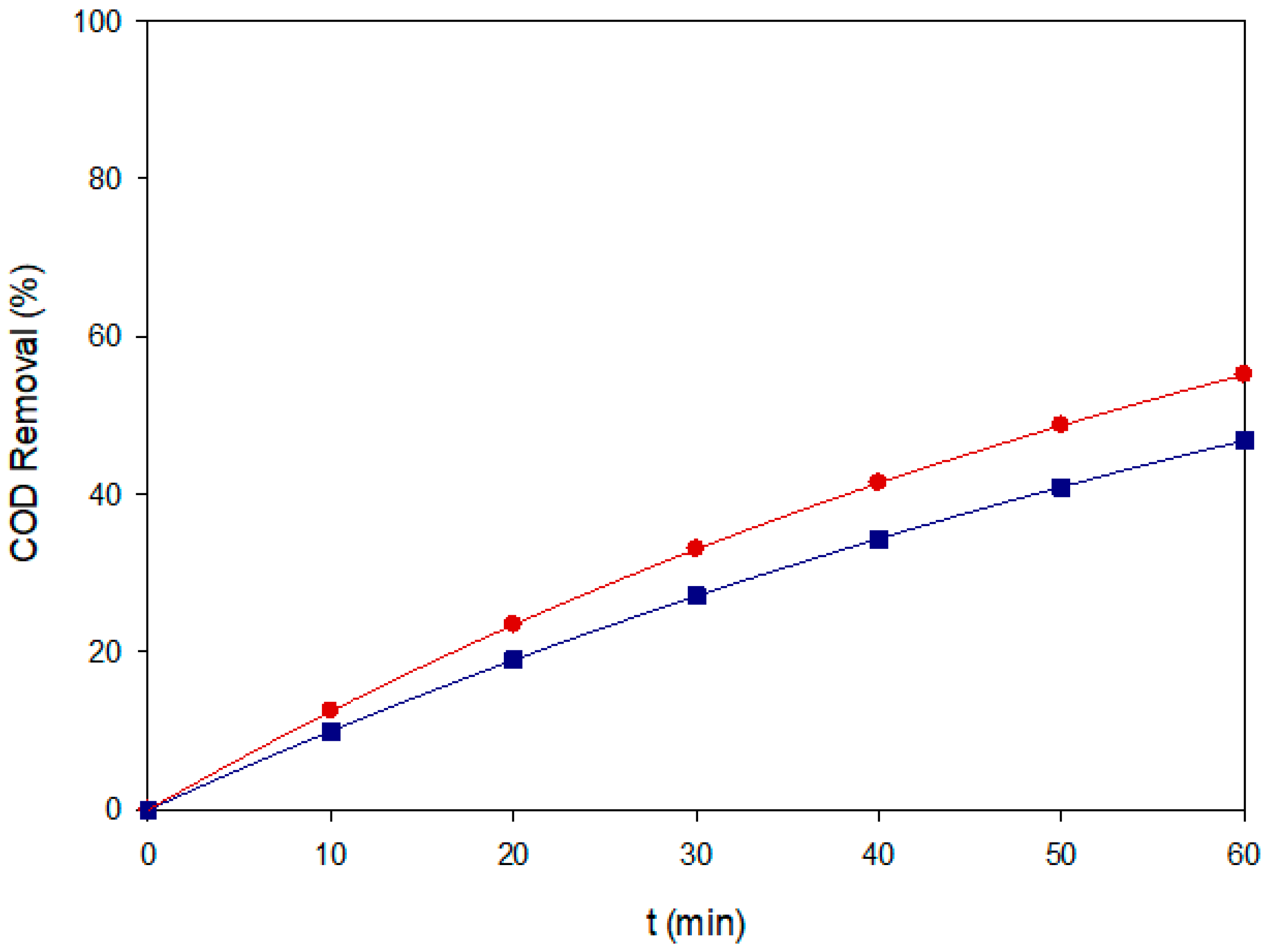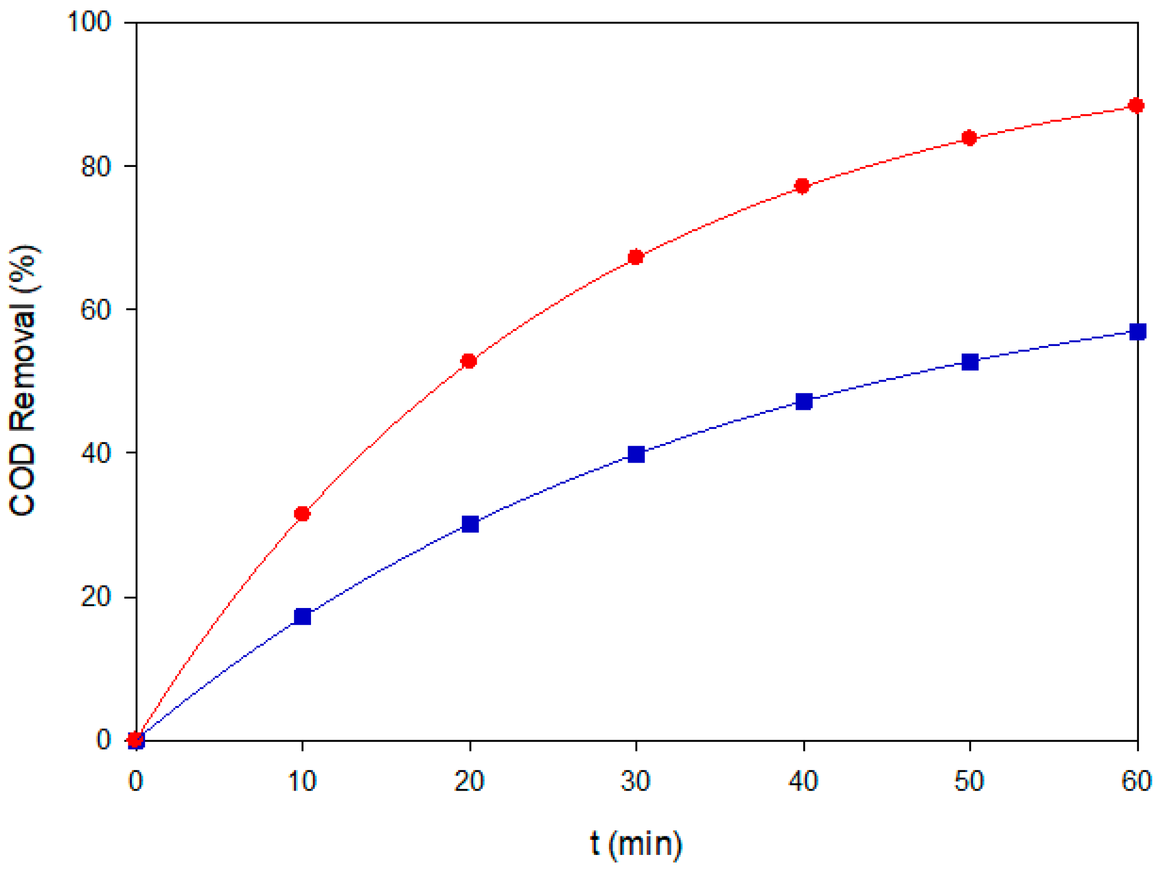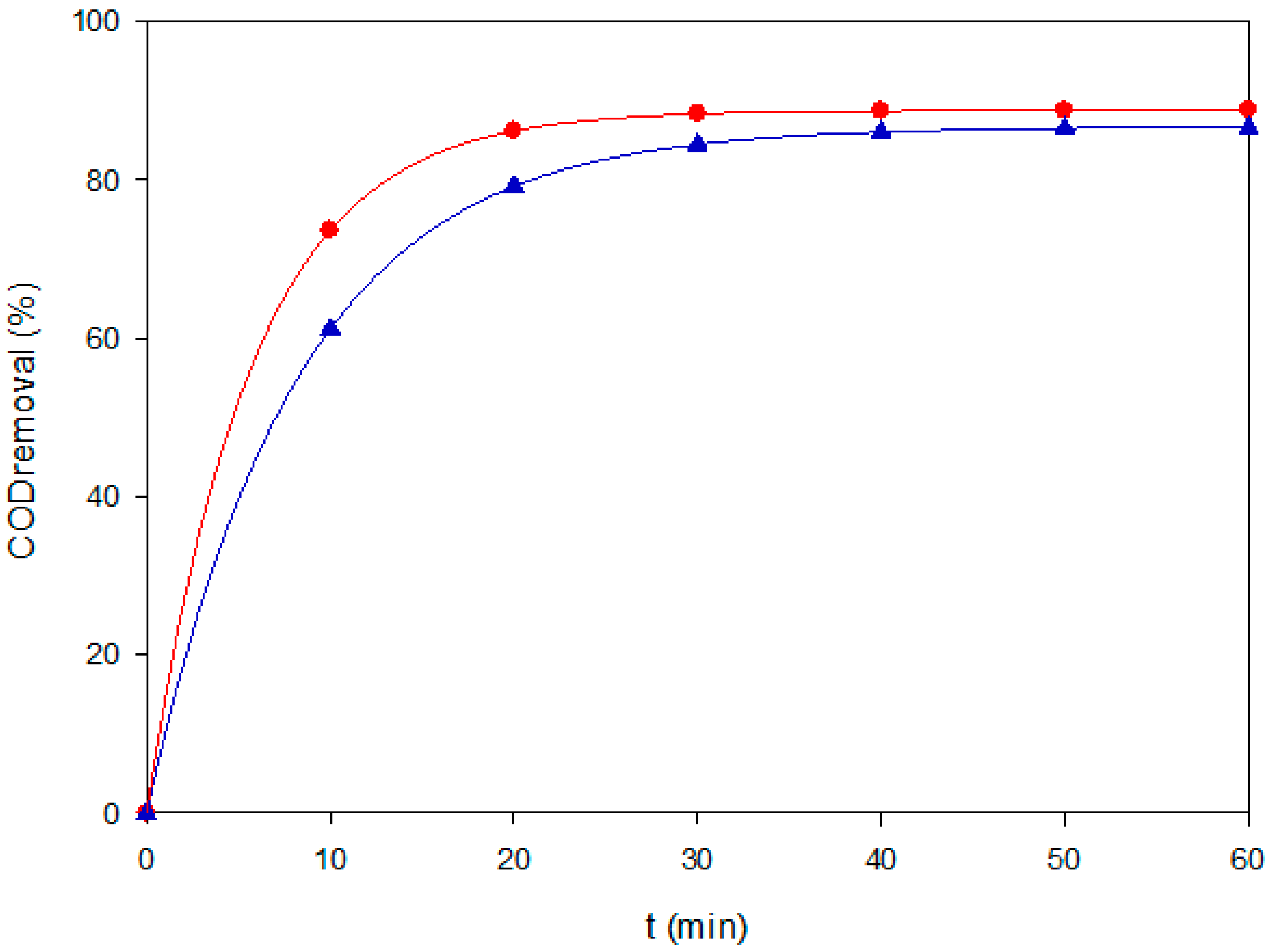 19]. Complementary mineralization was assessed through COD decay at higher loading (200 mg L