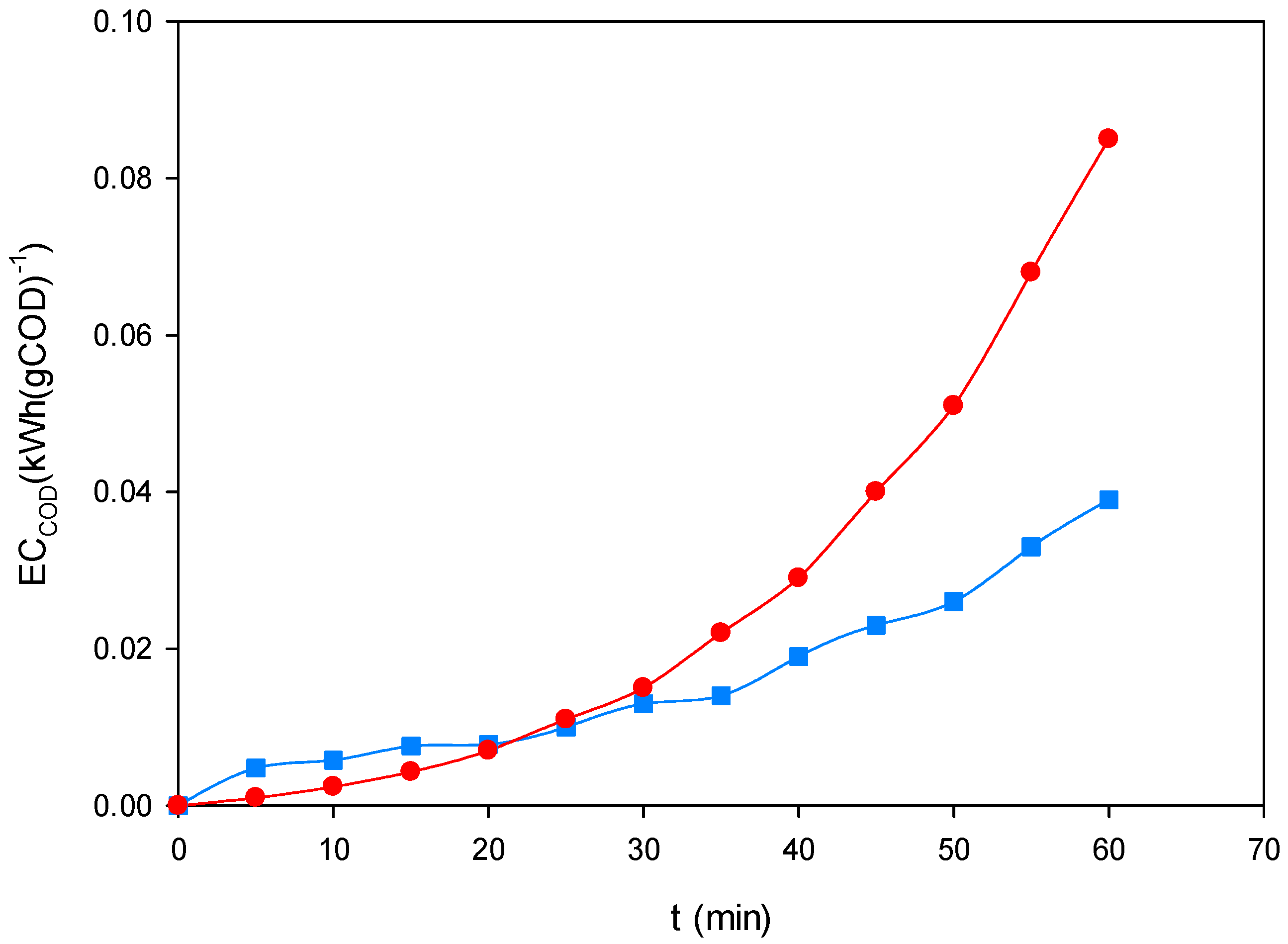 −1). This parameter enables a direct comparison of the efficiency of the processes in terms of the energy invested per unit of contaminant effectively mineralized, avoiding the overestimation of efficiency in systems where decolorization does not necessarily translate into COD removal. EC