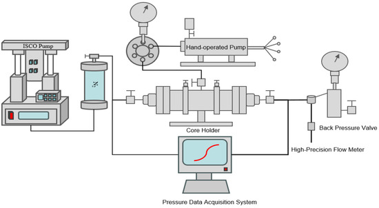 The experimental procedure for stress sensitivity testing of tight conglomerate reservoirs is illustrated in Figure 1. The main apparatus includes a core holder, ISCO high-pressure piston pump, back-pressure valve, hand pump, pressure acquisition system, and a high-precision flowmeter. Among these, the core holder is the primary device, manufactured by Hai’an Scientific Instrument Co., Ltd. (Nantong, Jiangsu Province, China), which can accommodate cores with a diameter of 2.54 cm and a length of 5–10 cm, and withstand a maximum pressure of 30 MPa. The hand pump and back-pressure valve, supplied by Jiangsu Hai’an Petroleum Scientific Instrument Co., Ltd., are used to control the net stress applied to the core samples. The ISCO high-pressure piston pump is capable of operating in single- or dual-pump modes under constant pressure or constant flow, providing precise flow rate and pressure control over a wide operating range.