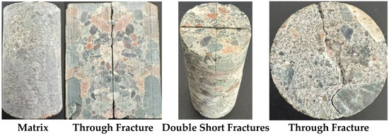 The experimental cores were first subjected to solvent cleaning to remove residual oil. After cleaning, the cores were numbered and placed in an oven at 85 °C for 24 h to ensure complete drying. The dried cores were then measured for length and diameter, and their initial permeability were determined. Based on the experimental requirements, the cores were subsequently prepared with different fracture geometries. Representative core samples with distinct fracture configurations are shown in Figure 2. Specifically, the matrix core was left untreated; the through-fracture core was created by vertically cutting along the core axis to penetrate the entire core; the double-short-fracture core was first cut vertically along the axis to the midpoint of the core, followed by another vertical cut of equal length perpendicular to the first fracture, and finally separated at the midpoint along the axis perpendicular to the core to isolate the fractured section from the intact portion. For the micro-fractured core, the sample was first wrapped with a heat-shrink sleeve, and a 5 mm steel wire was placed at the center of the upper end face as a stress concentrator. The core was then mounted in a hydraulic fracturing press to induce fracturing. To enhance fracture development, the procedure was repeated by fixing the steel wire at the lower end face center and performing a second fracturing treatment. Four representative core samples with similar initial permeabilities were selected, and four fracture types were constructed: matrix, through-going fractures, double short fractures, and micro-fractures. Matrix cores, without induced fractures, represent fracture-free portions, while through-going and double short fracture cores simulate simple fractures. Micro-fractures mimic complex fracture networks with high density, varied development, and connectivity, enabling investigation of stress sensitivity under different fracture complexities. All four cores have similar permeabilities below 1 mD and heterogeneous gravel distributions, effectively representing the typical lithology of the Mahu Oilfield reservoir. However, due to spatial heterogeneity in lithology, pore structure, and fracture characteristics, the small sample size may limit the representativeness of the results and may not fully capture reservoir-scale variations in fracture distribution and heterogeneity.
