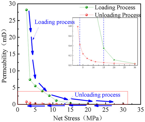 Following fracture preparation, the cores were mounted in the core holder, and the experimental system was assembled according to the procedure shown in Figure 1. The confining pressure was maintained constant at 30 MPa, while the backpressure was adjusted to set net stress intervals of 2.5 MPa, 3.5 MPa, 5.0 MPa, 7.0 MPa, 9.0 MPa, 11.0 MPa, 15.0 MPa, 20.0 MPa, and 30 MPa. At each stress level, the core was stabilized for 30 min, after which inlet and outlet pressures and flow rates were recorded to calculate permeability. Permeability was measured under a constant pressure differential and flow rate for at least 10 min. Each test was repeated three times, and results with a relative error below 3% were reported. Upon reaching the maximum net effective stress, unloading was performed by gradually decreasing the net stress according to the same intervals. At each unloading point, the system was stabilized for 1 h, followed by measurements of inlet and outlet pressures, flow rates, and permeability. The procedure was repeated for each experimental core.