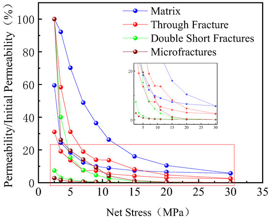 According to the reservoir sensitivity evaluation method, the stress sensitivity damage of matrix cores can be classified as moderately weak, that of through-going fractures as moderately strong, while double-short fractures and microfractures both fall into the category of strong stress sensitivity. Although fractured cores experience significant permeability damage due to extensive fracture closure under net stress loading, fractures can never be completely closed, even at the maximum applied net stress. As a result, residual flow channels remain, and the post-loading permeability of fractured cores is still higher than the initial permeability of matrix cores. This observation demonstrates that when fracture networks are present, their flow capacity largely overshadows the contribution of the matrix, highlighting the crucial role of fractures in enhancing reservoir flow performance.