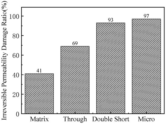 The degree of irreversible permeability damage under different fracture conditions is shown in Figure 8. Among all tested cores, matrix cores exhibit the lowest permeability damage (41%), followed by through-going fractures (69%), double-short fractures (93%), and microfractures with the highest degree of damage (97%). For matrix cores, permeability reduction is primarily controlled by pore structure compaction and collapse during net stress loading, with partial recovery of the pore structure upon unloading. Thus, the internal spatial configuration of the matrix core does not undergo significant changes throughout the stress cycle. In contrast, fractured cores exhibit stronger stress sensitivity due to the presence of fractures. During the initial stage of net stress loading, fracture closure dominates permeability reduction. The asperities of gravel clasts embedded along the fracture walls gradually crush into the opposing surfaces, leading to smoother fracture surfaces and a rapid decrease in effective flow channels. At later stages, as fractures are fully closed, compaction of the matrix pore structure becomes the dominant factor controlling permeability reduction. During the unloading process, the strong plasticity of the reservoir prevents the gravel asperities from re-emerging, hindering effective fracture reopening. Meanwhile, the recovery of the matrix pore structure remains limited. Compared with the loading process, the internal spatial configuration of the core is significantly altered, with the loss of high-permeability flow channels, making it difficult for the permeability to recover to its initial state. Therefore, the more developed the internal fracture network, the more difficult it is for the spatial structure to recover, and the stronger the stress sensitivity.