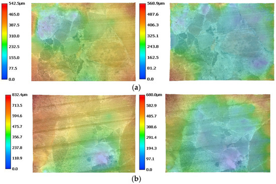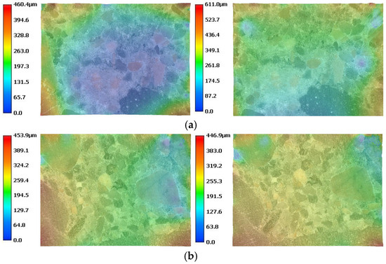 Micro-imaging of the double-short-fracture walls in both longitudinal and transverse directions before and after net stress loading is presented in Figure 11a,b. As shown in Figure 11a, prior to loading, the longitudinal wall exhibits a green streak extending from the upper-left to the lower-right corner, interspersed with small purple regions, while yellow shadows on both sides gradually transition to red, indicating the presence of a longitudinal trough with pronounced height differences. This highly heterogeneous trough structure provides effective high-velocity flow channels. After net stress loading, the longitudinal wall appears predominantly uniform in green, with only small yellow patches remaining in the lower-left corner, and the original trough disappears, indicating a smoother wall surface. As shown in Figure 11b, the transverse wall initially displays a high-to-low vertical trend before loading, which is reduced after loading, resulting in a more even and planar surface.