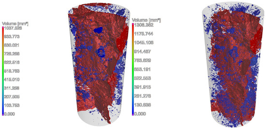 The CT imaging of the microfractured core before and after net stress loading is presented in Figure 13. Significant alterations in the spatial structure of microfractures were observed before and after net stress loading. From the perspective of fracture volume distribution, the total volume of large-scale fractures, represented by the red regions, was markedly reduced, while the sheet-like connectivity between fractures decreased substantially. This indicates that, under high confining stress, the original large-scale fractures underwent significant shrinkage and closure, leading to the destruction of inter-fracture connectivity. Simultaneously, after net stress loading, numerous small-scale fractures, represented in blue, were generated, predominantly distributed around the peripheries of large-scale fractures or near the tips of pre-existing cracks. The occurrence of these small-scale fractures suggests that the closure of large-scale fractures triggered localized stress concentration, which in turn induced the formation of secondary small fractures.